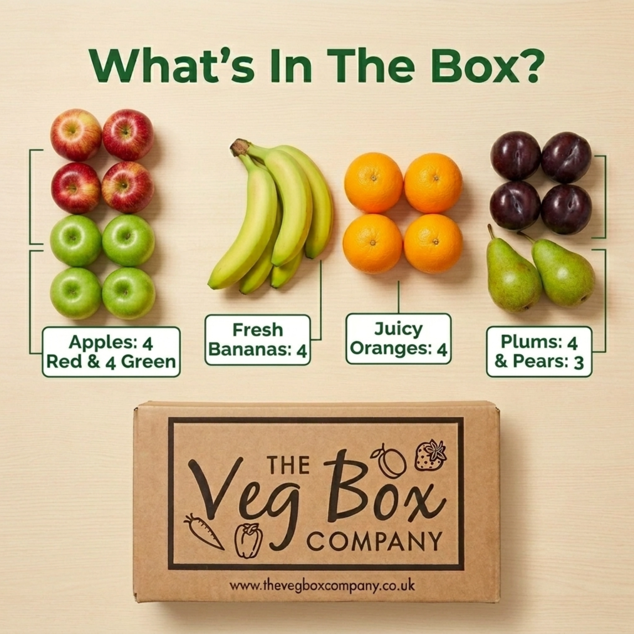 • 2 Other Seasonal Items: Enjoy a surprise selection of fresh, seasonal fruits to keep your box exciting and varied. Potential seasonal fruits could include plums, kiwi, pears, nectarines, blueberries, satsumas, just to name a few.