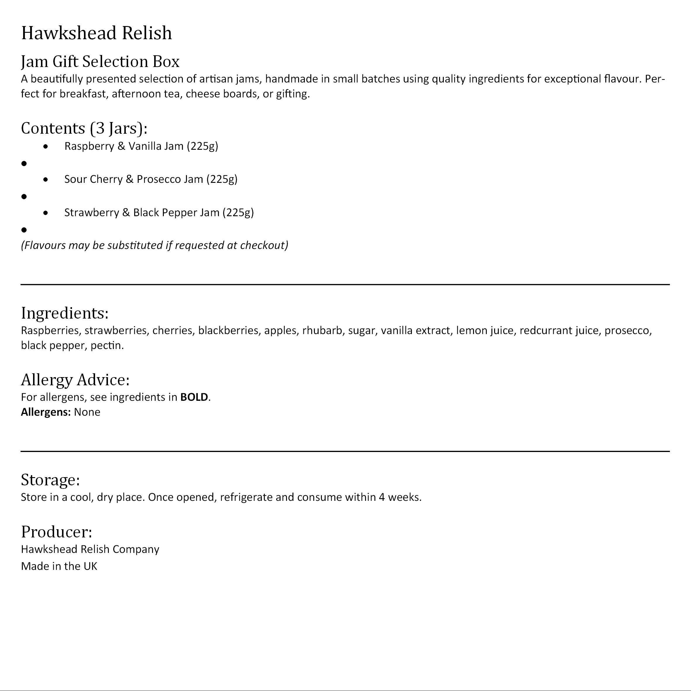 Allergy Advice: For allergens, see ingredients in BOLD . Produced by Hawkshead Relish Company.